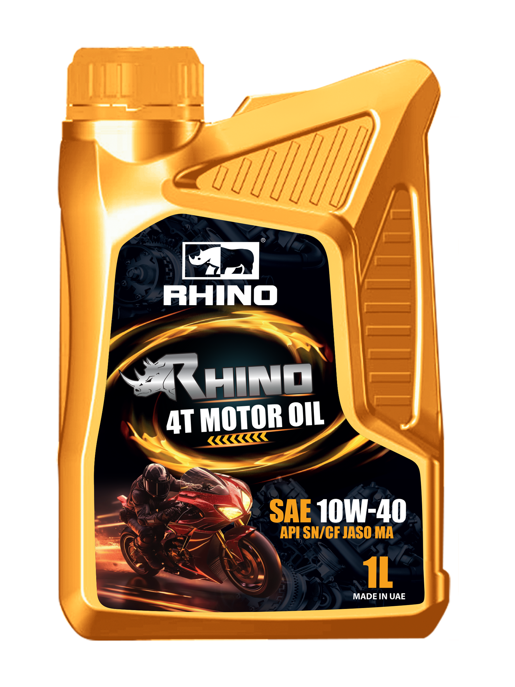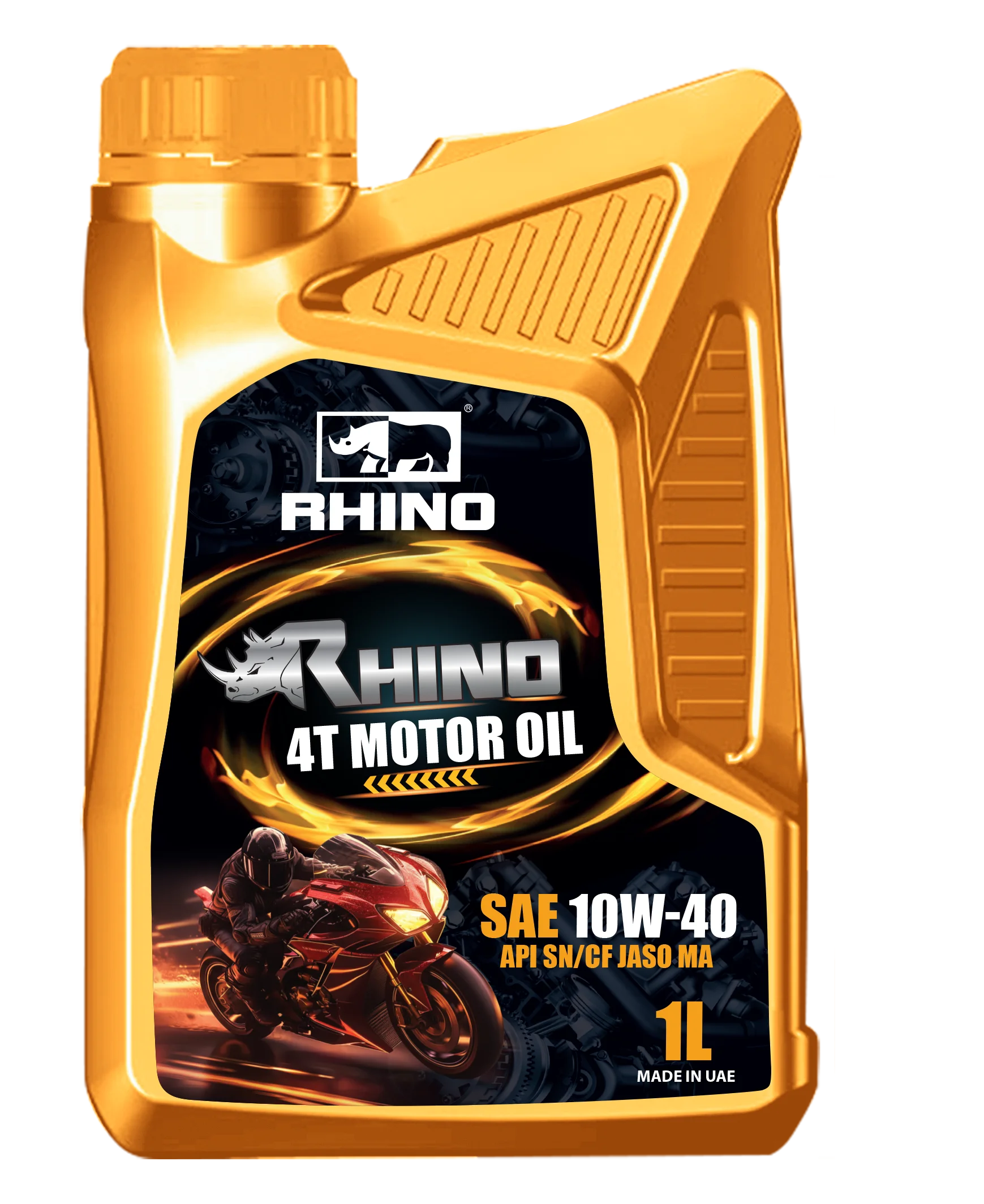 RHINO 4T RACING MOTOR OIL SAE 10W40 API SN/CF JASO MA provides superior oil film strength, heat resistance and oil shear protection. It provides superior oil film strength and heat resistance for the protection of engine compression & oil sealing rings, cylinder sleeve lubrication, bearing and valve train. Viscosity fluctuations with temperature variations are minimal, thus creating less friction in the engine. This enhances the power-output and fuel economy of your race bike. This oil easily resists high temperatures and reduces deposits.
