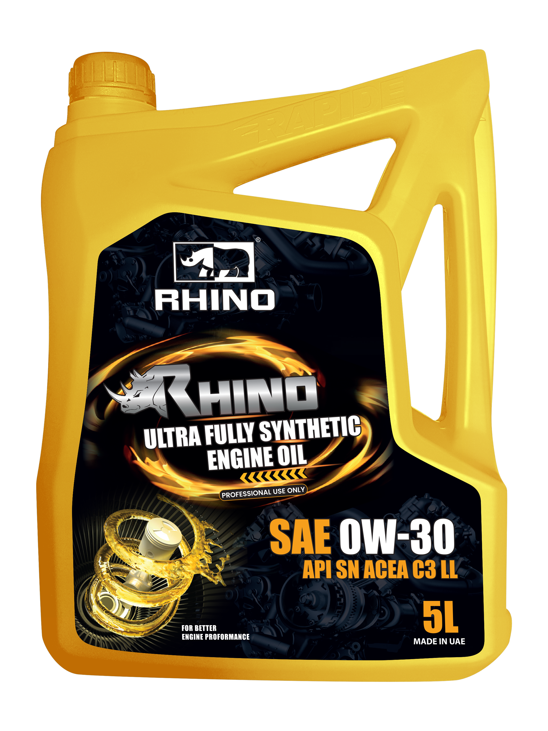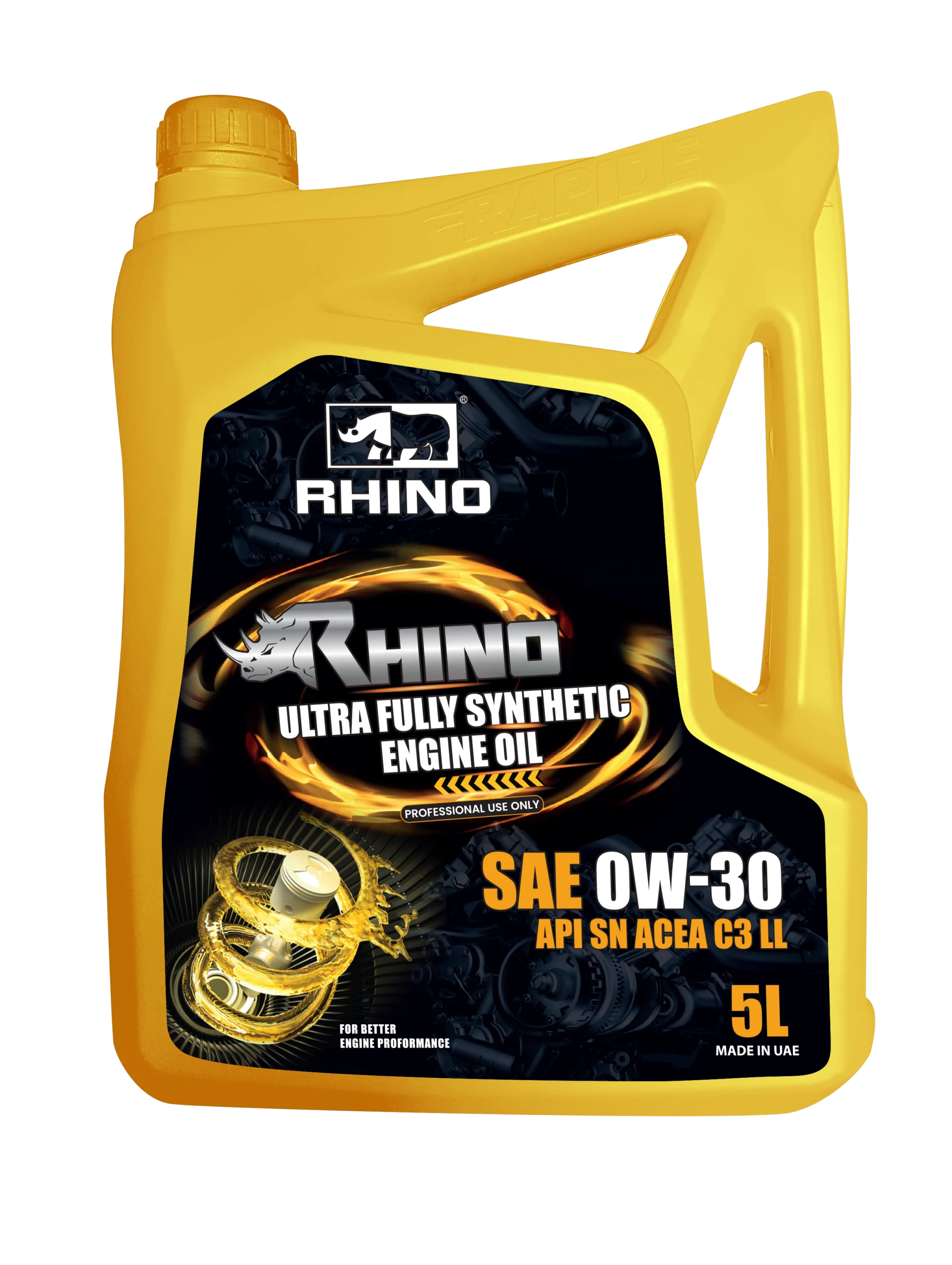 RHINO ULTRA FULLY SYNTHETIC ENGINE OIL SAE 0W-30 SN C3 is a fully synthetic lubricant based on carefully selected, very high-quality base oils. It is specifically formulated to meet the most demanding VW specifications currently available – VW 504.00 and 507.00 – as well as the VAG Group’s Long-Life III requirements. It is a Mid SAPS oil that meets Euro 4 and Euro 5 standards and provides diesel particulate filter protection. This viscosity grade provides proven fuel savings compared to a 5W-30 grade.